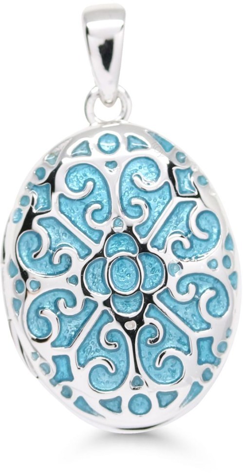 Ovaalin muotoisessa hopeamedaljongissa on kaunis ornamenttikuvio ja tehosteena vaaleansininen emalipohjainen väritys. Korussa on tukeva kuori, joka mahdollistaa taustapuolelle tehtävän kaiverruksen.