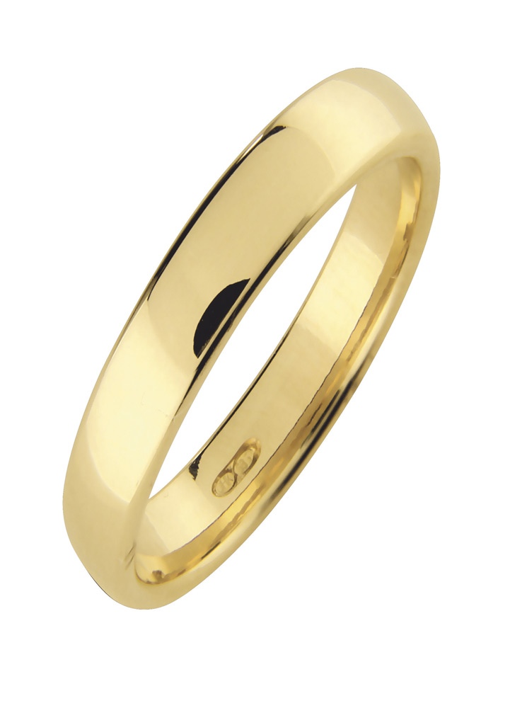 Kotimainen kultainen kihlasormus, jonka sisäpuoli on pyöristetty miellyttävän tuntuiseksi. Materiaali: 14k keltakulta, Leveys 3,2mm
