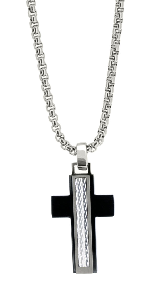 Teräksestä valmistettu kaulakoru, joka ei jätä kylmäksi. Ristin pinta on musta ja sen pintaan on leikattu tyylikkäät timanttileikkaukset. Timanttileikkaukset tuo hienosti esiin vaalea pohja, jolle teräksen värinen laatta on asennettu. Ristin koko on 19x33,5mm, ketjulla on pituutta 50-55cm. Pituutta on siis mahdollista säätää tarpeen vaatiessa välilenkkien avulla. Ketjun tyyli on pyöreä venetsia, mikä sopii ristiin tyylikkäästi.
