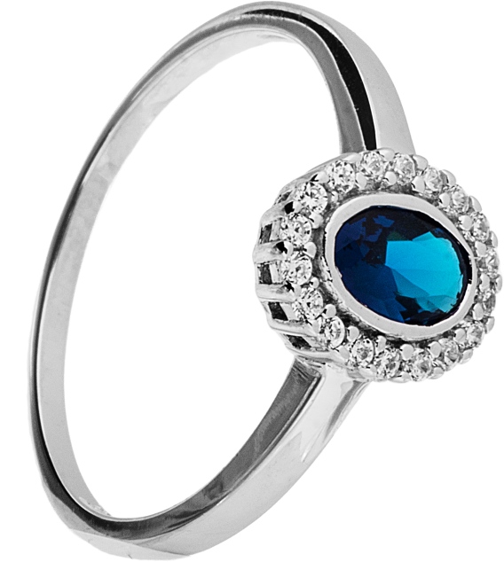 Kaunis Diana hopeasormus. Sormuksessa tyylikäs sininen keskikivi, jota ympäröi upeat, kirkkaat zirkonit!