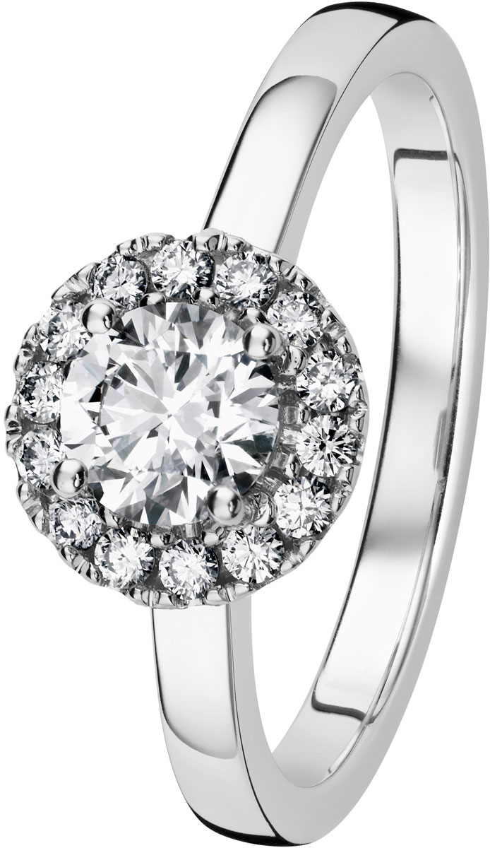 Sormuksen sirossa rungossa olevan halo-istutuksen keskellä säihkyy 0,30 karaatin painoinen keskikivi, jota reunustaa 14 kappaletta 0,01 karaatin painoista timanttia.