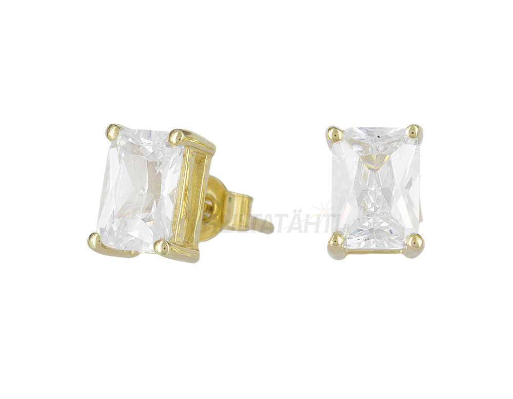 Kultaiset korvakorut ERK2858 Kultaisissa korvanapeissa kiiltelee suorakulmaiseksi hiottu kirkas zirkonia neljän krapin kiinnittämänä