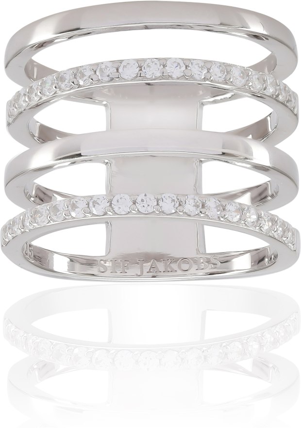 Ajaton Sif Jakobs Siena Quattro sormus. Sormus on valmistettu hopeasta. Säilyttääkseen kimaltavan kirkkautensa on sormus myös rodinoitu. Sormuksen korkeus on 1,5 mm ja leveys 15,5 mm. Sormuksessa kimaltelee kirkkaat zirkonit.
