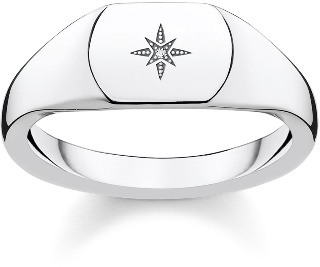Tyylikkäällä tähti-istutuksella koristeltu Thomas Sabo sormus, jonka leveys on 10mm. Sormuksen keskellä on siis aito timantti, joka antaa sormukselle hieman kimallusta.