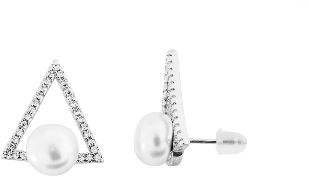 Zirkoneilla ja helmellä koristellut kolmion muotoiset tappikorvakorut.