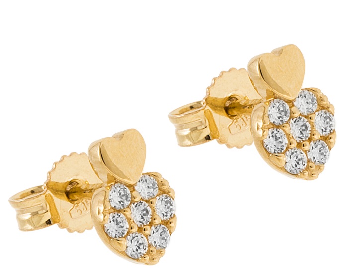 Tuplasydän korvakorut, joissa kahdet erikokoiset sydämet päällekkäin. Ylemmissä sydämissä tyylikäs kullanväri, alemmissa loistaa kirkkaat zirkonit.