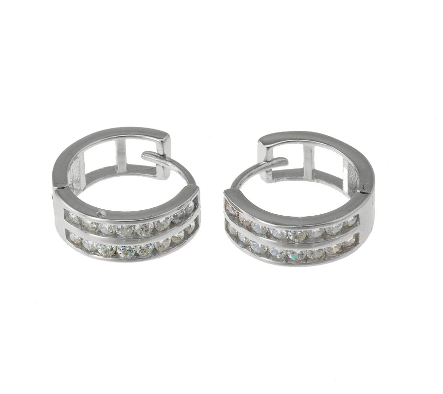14 karaatin valkokullasta valmistetut korvarenkaat, joissa säihkyy kirkkaita zirkoneita kahdessa rivissä.