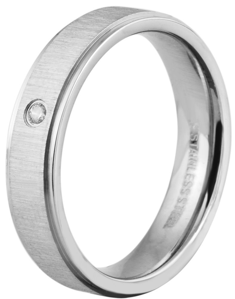 Tyylitelty teräksestä valmistettu kihlasormus, jota koristavat kaunis kirkas zirkoni, sekä harjattu keskikohta. Sormuksen leveys on 5mm ja paksuus 2mm.