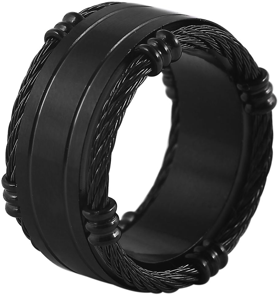 Näyttävä teräksestä valmistettu musta miesten sormus. Sormuksen leveys on näyttävä 13,5 mm. Sormuksen reunoilla on tyylikäs köysikuviointi.