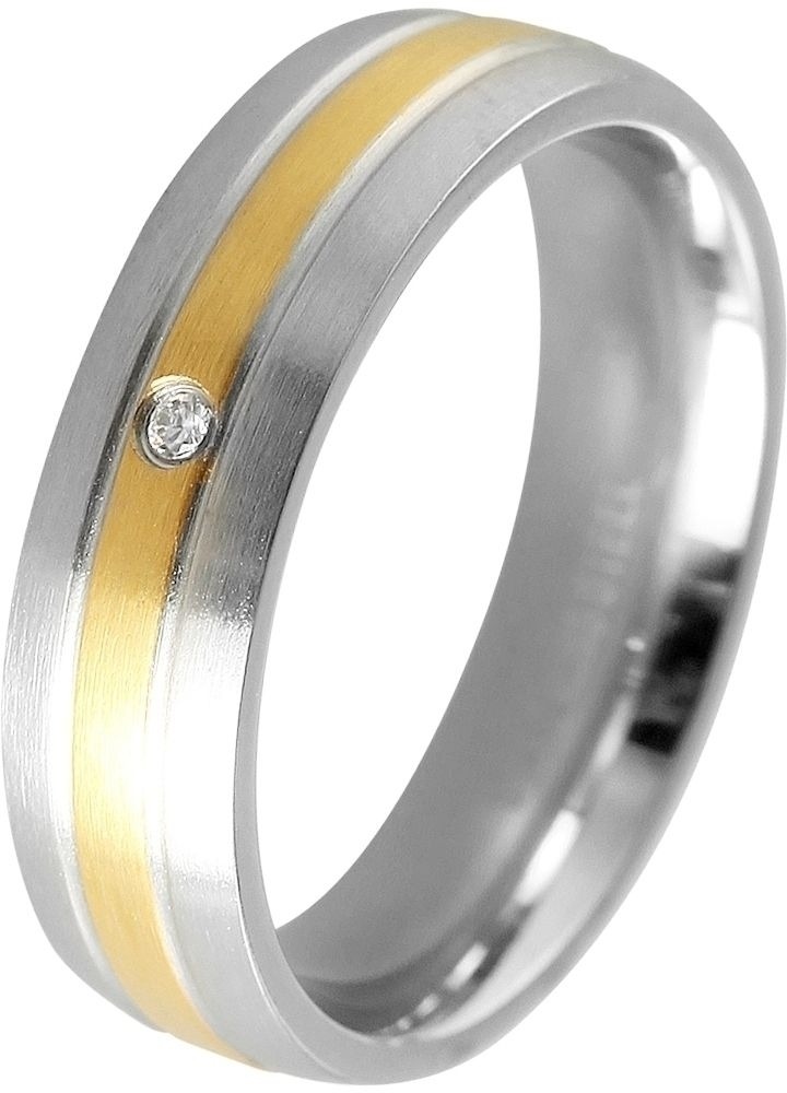 Näyttävä Scale terässormus, jonka kullan värisen raidan ja kirkkaan zirkonin muodostamaa pyhää liittoa reunustaa kaksi kaiverrettua uraa.
