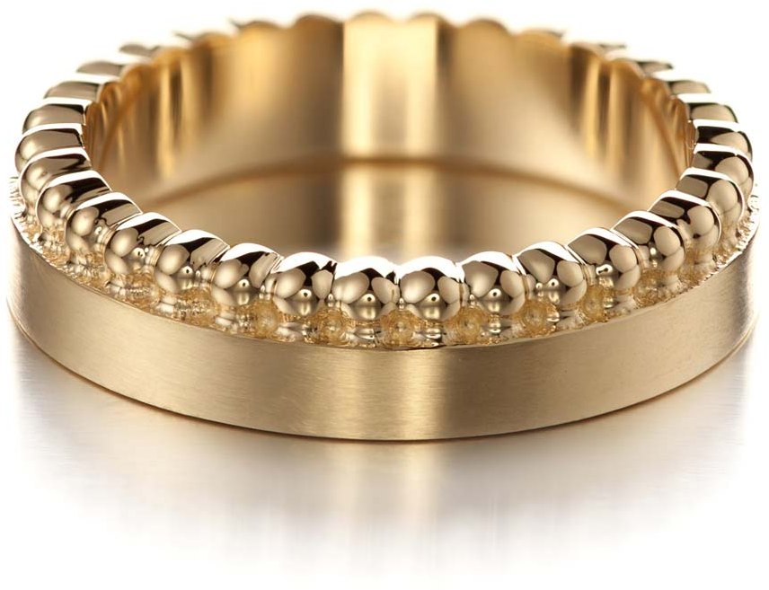 14 karaatin Keltakullasta valmistettu Hertta -sarjan sormus, jossa yhdistyy kauniis granulointia muodostava kiillotettu reuna ja harjatulla tekstuurilla koristettu runko.