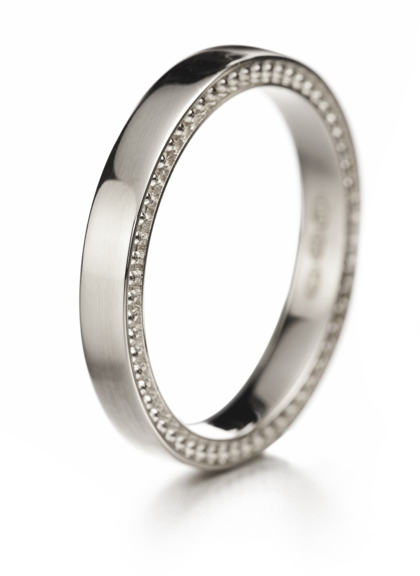 Sormuksen flakkamallista runkoa reunustaa kaunis kuviointi.