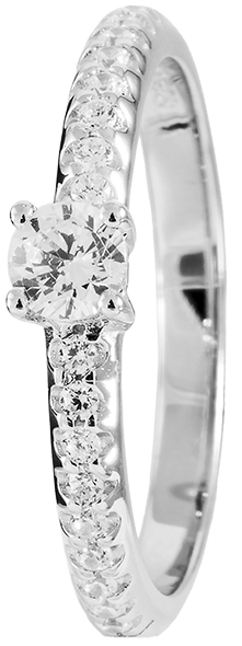 Kaunis hopeasormus, jossa lukuisat kirkkaat zirkonit on istutettu puoliinväliin sormuksen runkoa tuoden loistoa yhdessä kohoistutetun isomman zirkonin kanssa.