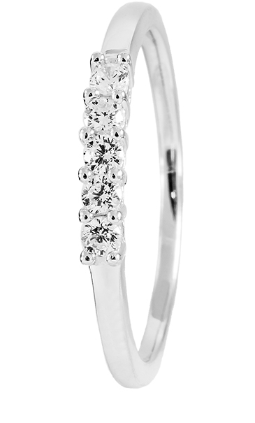 Hopeinen zirkoni sormus, jossa viisi kappaletta zirkon kiviä tuomassa loistetta.