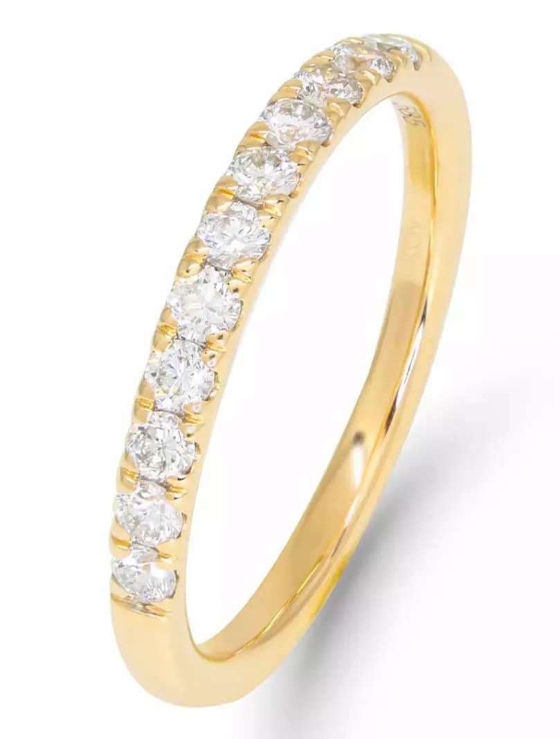 Sormus on valmistettu 14 karaatin keltakullasta, jonka pehmeä, lämmin sävy tuo timanttien kirkkauden kauniisti esiin. 2 mm leveä runko tekee sormuksesta sirosti istuvan ja miellyttävän käyttää päivittäin, mutta samalla riittävän kestävän jokapäiväiseen käyttöön. Tasapainoinen muotoilu tuo timanttirivin esiin hienostuneesti ja tekee sormuksesta tyylikkään myös yksinään.