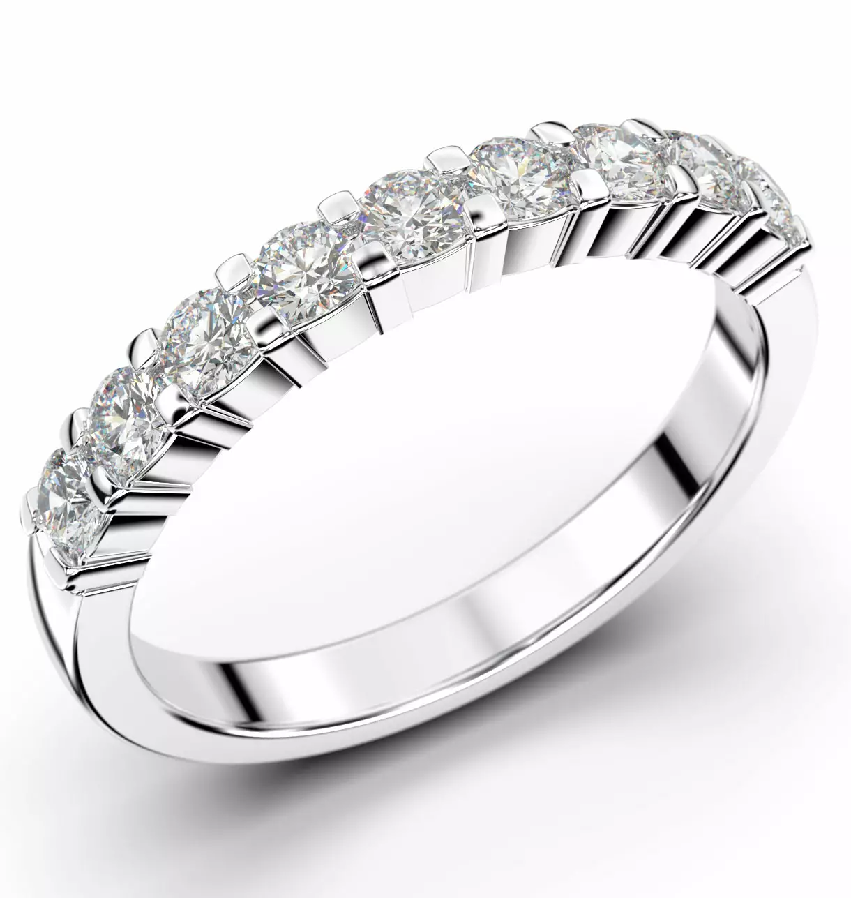 Kaunis rivitimanttisormus, jossa timantit on istutettu krappi-istutukseen ja jokainen timantti on neljällä kynnellä kiinnitetty.