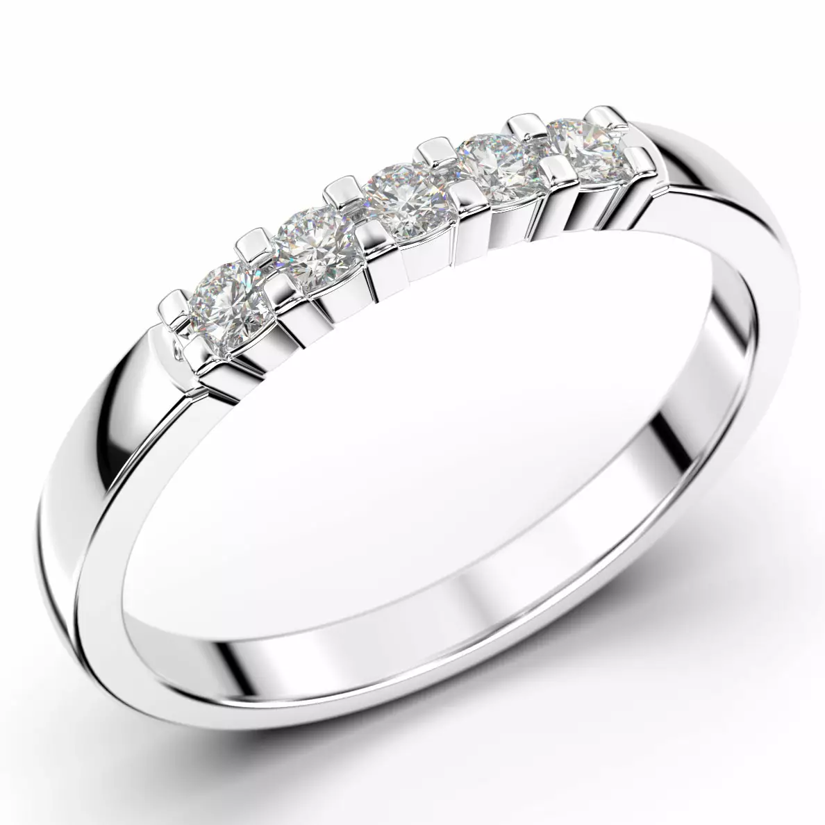 Kaunis rivitimanttisormus, jossa timantit on istutettu krappi-istutukseen ja jokainen timantti on neljällä kynnellä kiinnitetty.