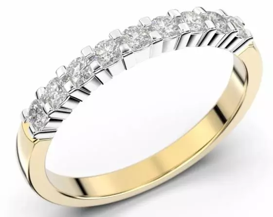 Kauniin siro rivitimanttisormus, jossa timantit on istutettu krappi-istutukseen ja jokainen timantti on neljällä kynnellä kiinnitetty.