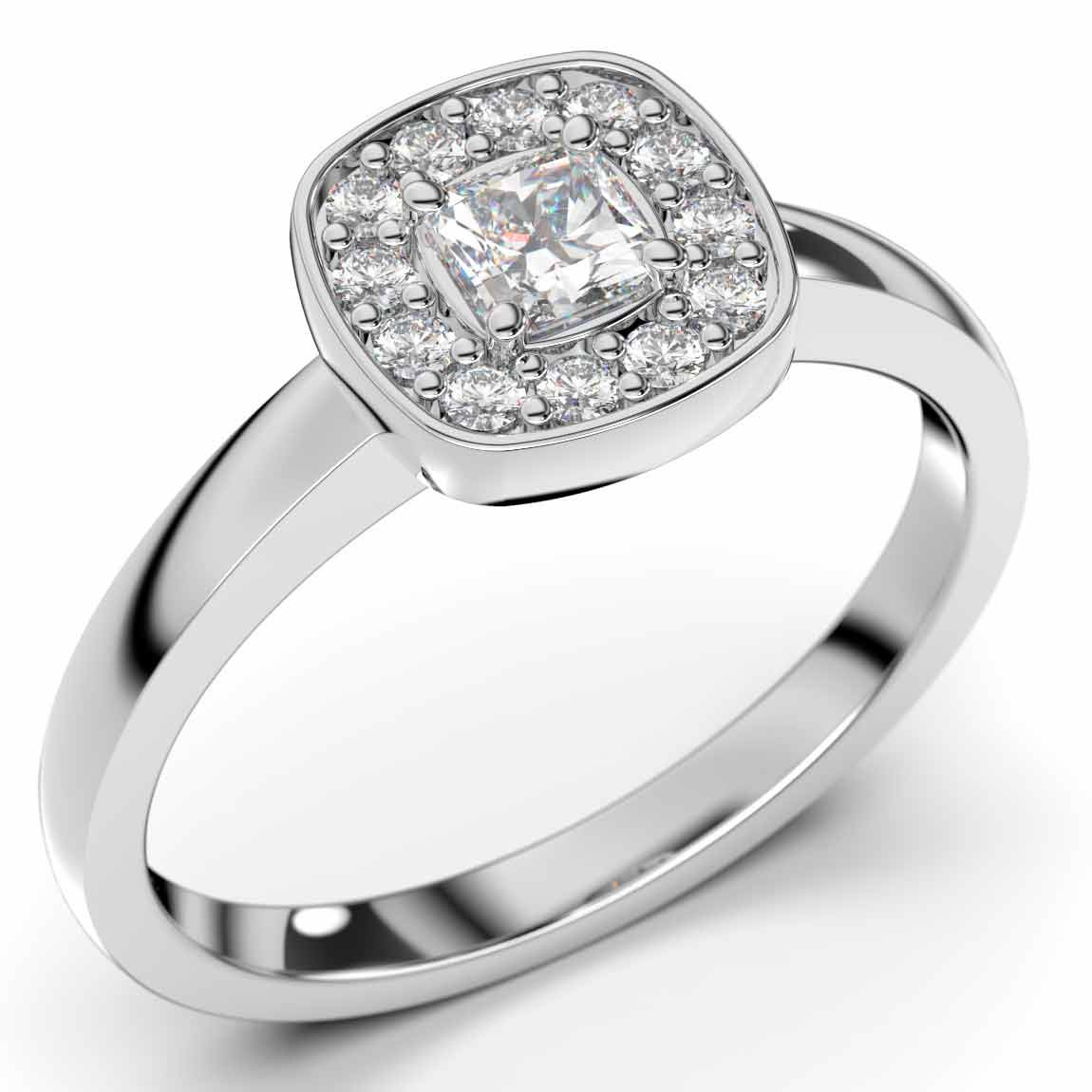 Festive Alicia sormuksen näyttävässä halokehyksen keskellä säihkyy 0,12 karaatin painoinen acher -hiottu timantti, jota reunustaa 12kpl 0,01 karaatin painoista briljantti -hiottua timanttia. Sormuksen profiililtaan flakka runko on valmistetty 14 karaatin valkokullasta ja sillä on leveyttä 2,1mm
