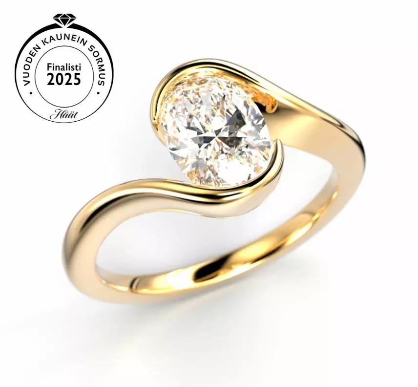 Festive Auréa-timanttisormus on kunnianosoitus ajattomalle kauneudelle ja rohkealle muotoilulle. Tämä Vuoden Kaunein Sormus 2025 -finalisti hurmaa yksinkertaisella, mutta vaikuttavalla muotoilullaan. Sormuksen keskellä säihkyy 1,00 karaatin ovaalihiottu laboratoriotimantti (TW/VS), jonka kirkkaus ja tulenleikki vangitsevat katseen jokaisessa valossa.
