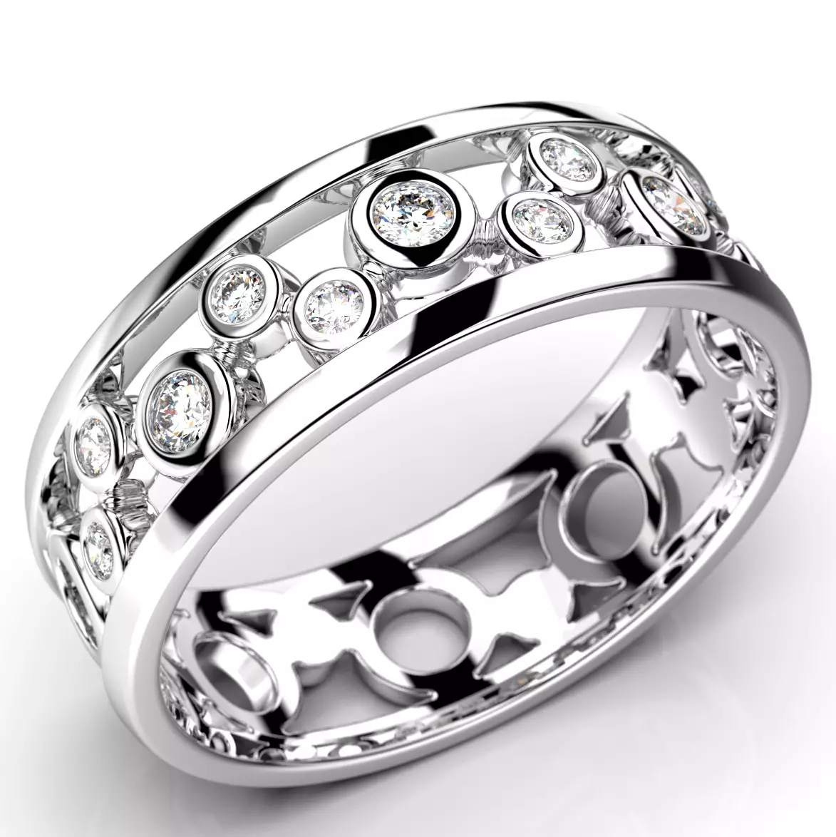 Sormuksessa on hauskaa pallokuviota, sekä timantteja. Sama kuvio ja timantit toistuvat ympäri sormuksen.