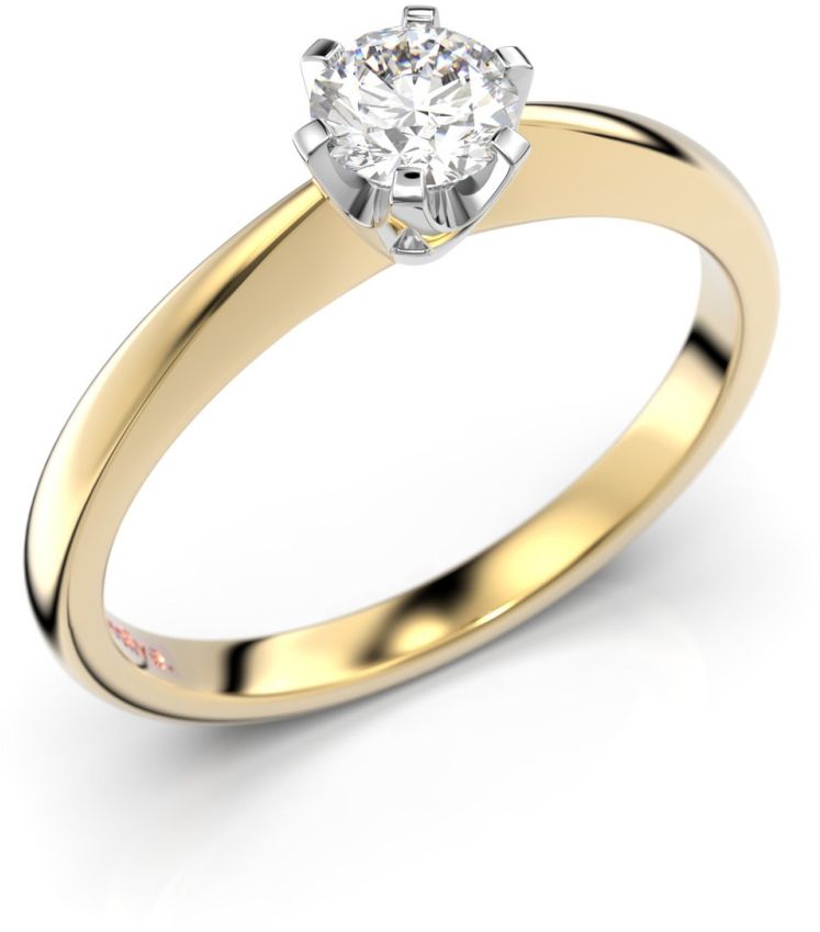 Klassinen yksikivinen timanttisormus, jonka keskipisteenä on kaunis kruunuistutettu timantti. Sormuksen runko on valmistettu 14 karaatin keltakullasta ja kruunuistutus kauniinsävyisestä valkokullasta. Timantti korostuu ja sormuksen luonne keveytyy rungon kapenevan ominaisuuden vuoksi.
