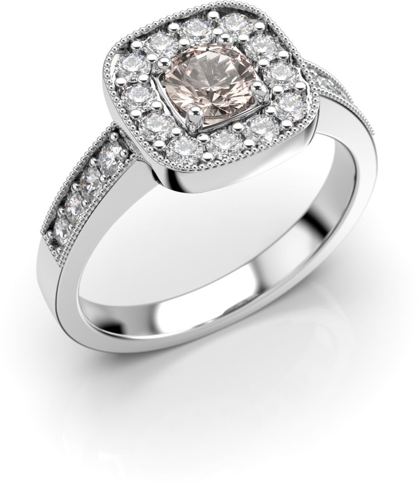 Morganiittia reunustaa Halo istutuksessa 12 kappaletta 0,02 karaatin timantteja, joiden lisäksi sormuksen runkoon on istutettu kummallekkin puolelle vielä neljä saman painoista timanttia.