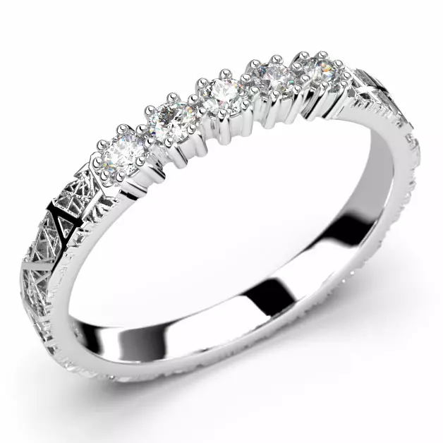 Sormuksen runko on koristettu rouhealla tekstuurilla ja viidellä säihkyvällä laboratoriotimantilla.