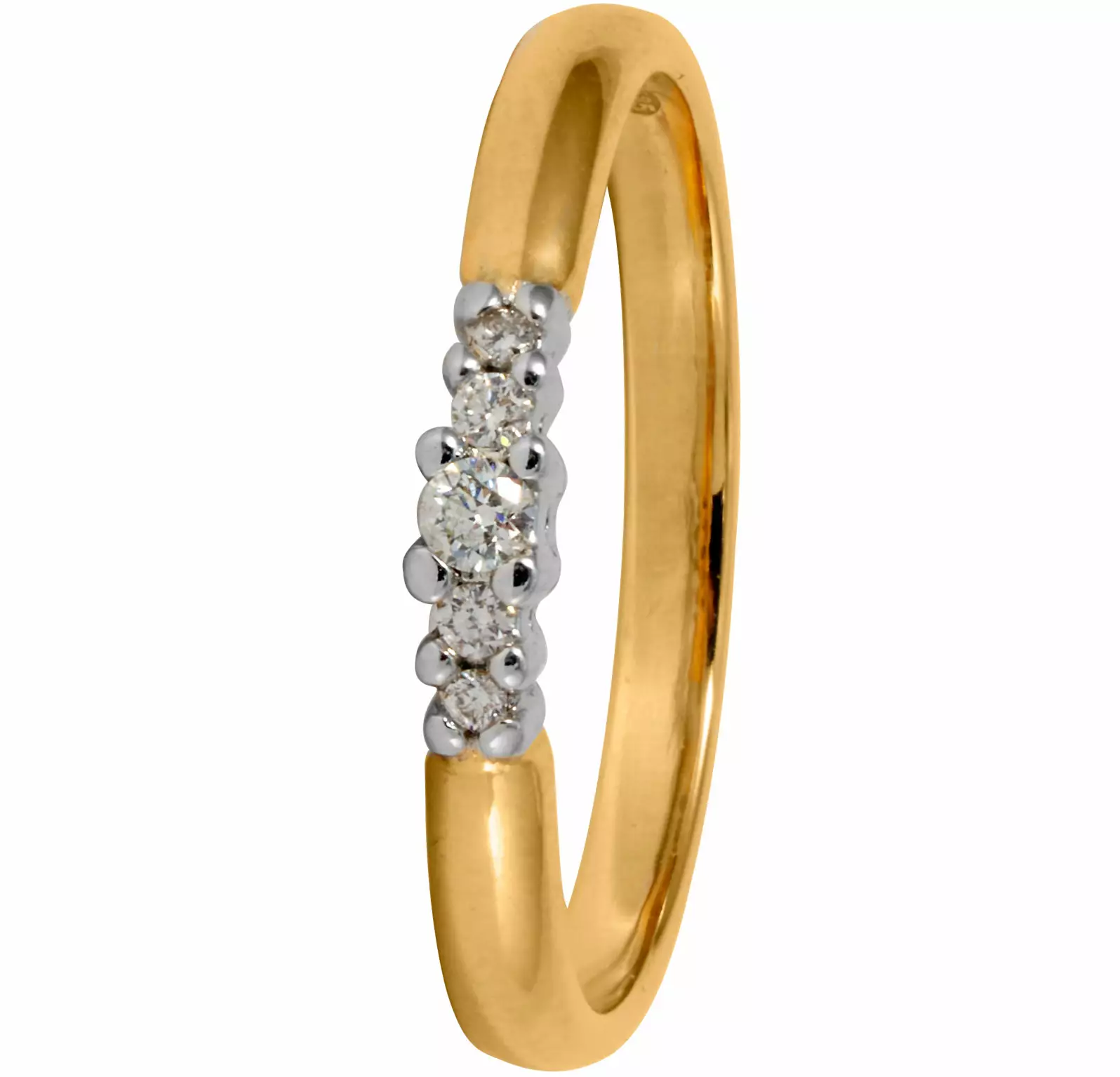 Tämä GoldStar-timanttisormus on valmistettu 14 karaatin keltakullasta ja siinä säihkyy viisi timanttia.