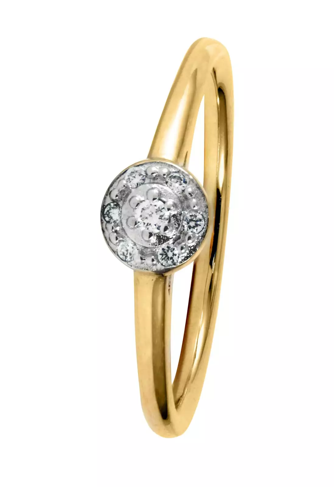 Saammeko esitellä - GoldStar timanttisormus, jonka halo-koriseessa säihkyy seitsemän timanttia.