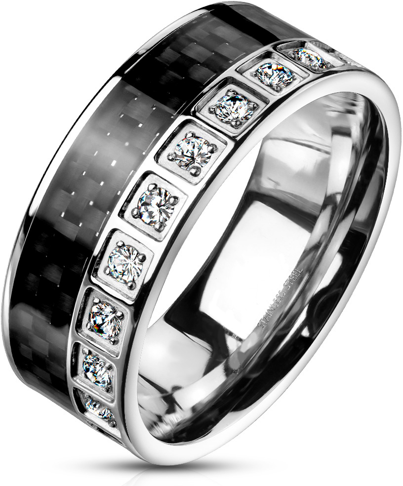 Näyttävä shine terässormus, jota koristaa musta hiilikuitukuviointi ja rivi zirkoneita.