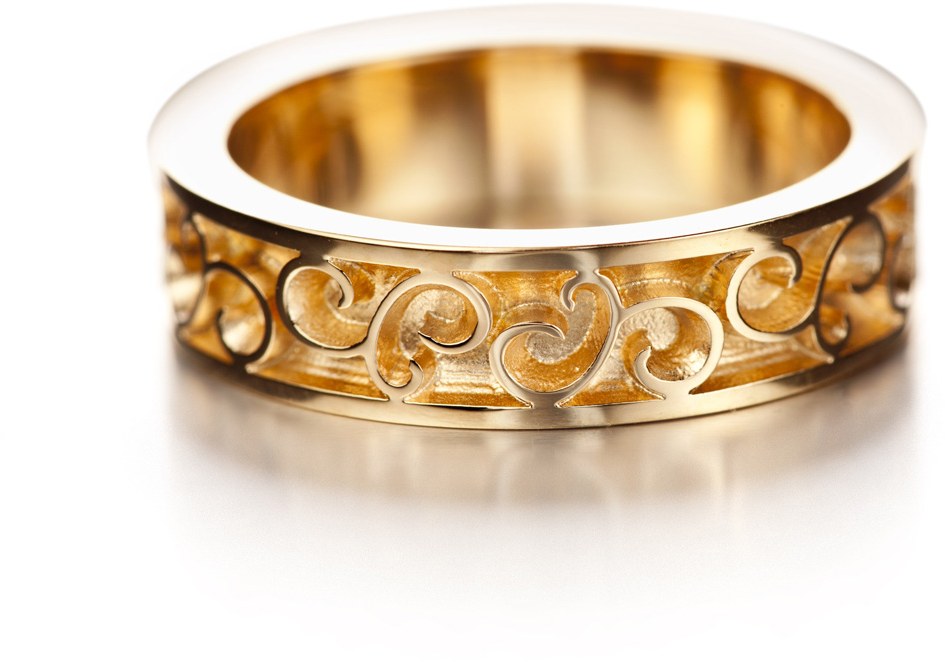 Lumova Kiara sormuksen pintaa koristaa kaunis filigraanityyppinen kuviointi. Materiaali: keltakulta, leveys: 5mm