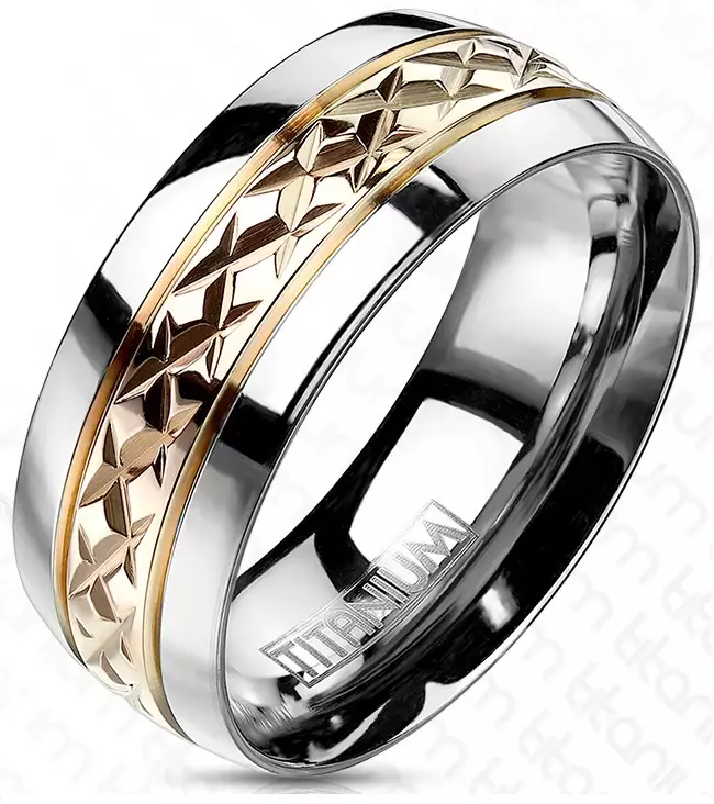 Titaani sormus H3700-8 Titaanista valmistettu, ruusukultaisen sävyinen kuvioitu keskiura. Leveys 8 mm