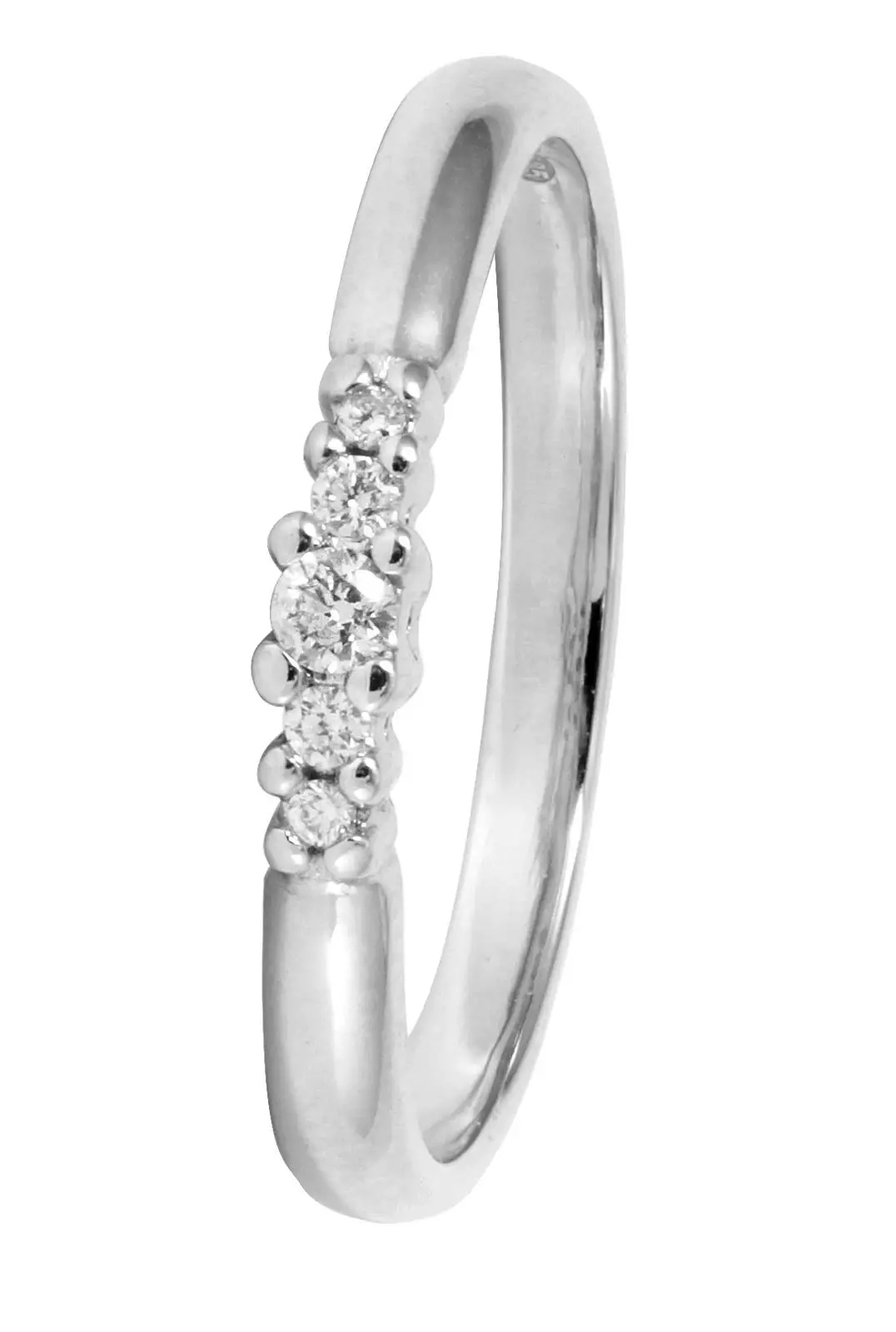 Tämä GoldStar-timanttisormus on valmistettu 14 karaatin valkokullasta ja siinä säihkyy viisi timanttia.