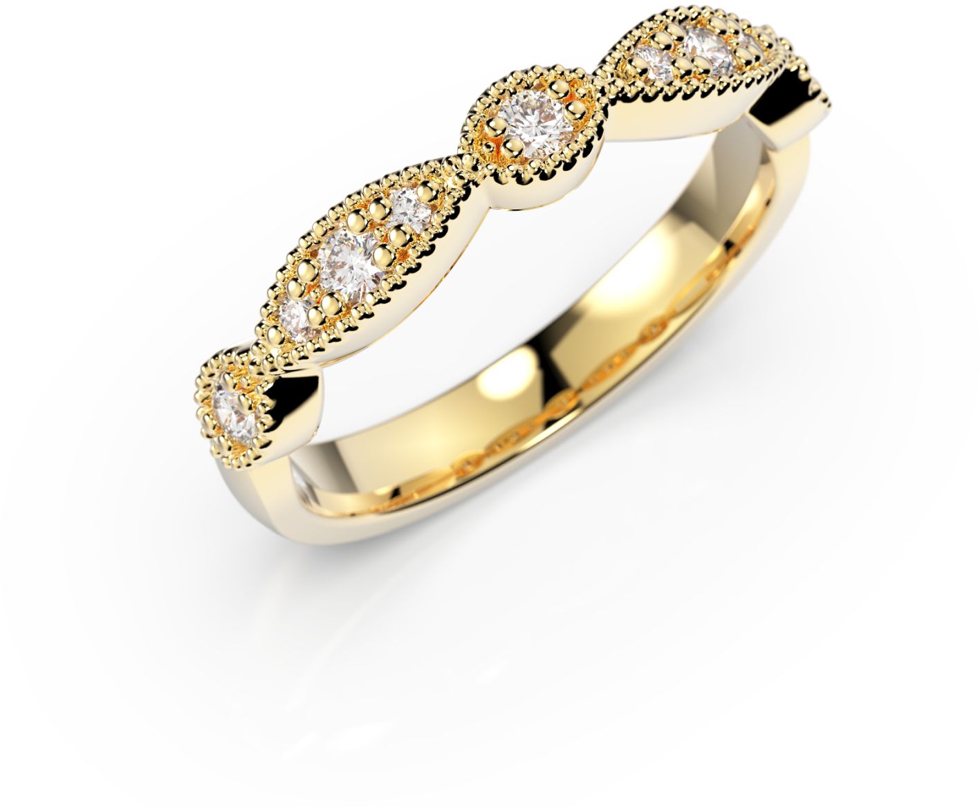 Herkkä Edith-timanttisormus, jonka keltakultaisessa rungonssa säihkyy pitsirae istetut timantit.