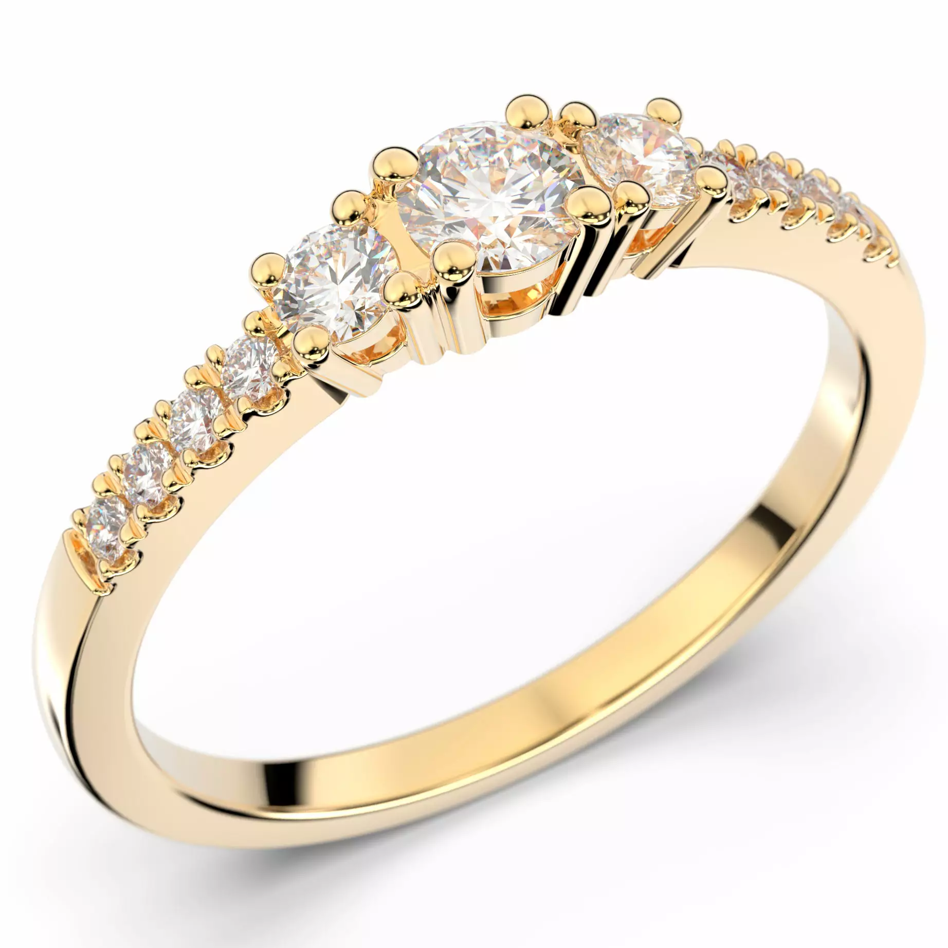 Erittäin kaunis Festive timanttisormus, jota koristavat kauniit timantit. Sormus on valmistettu 14 karaatin keltakullasta ja sen timanttien kokonaispaino on 0,33ct W/SI. Sormuksen keskelle on istutettu kolme kaunista timanttia (0,15ct ja 2x 0,05ct), joiden viereen on kahteen riviin istutettu neljä 0,01ct timanttia.