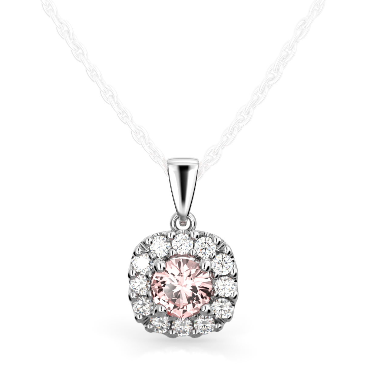 Ihastuttava Festive Janette -sarjan valkokultainen timanttiriipus, jonka keskiössä säihkyy vaaleanpunaisen sävyyn taittuva morganiitti.