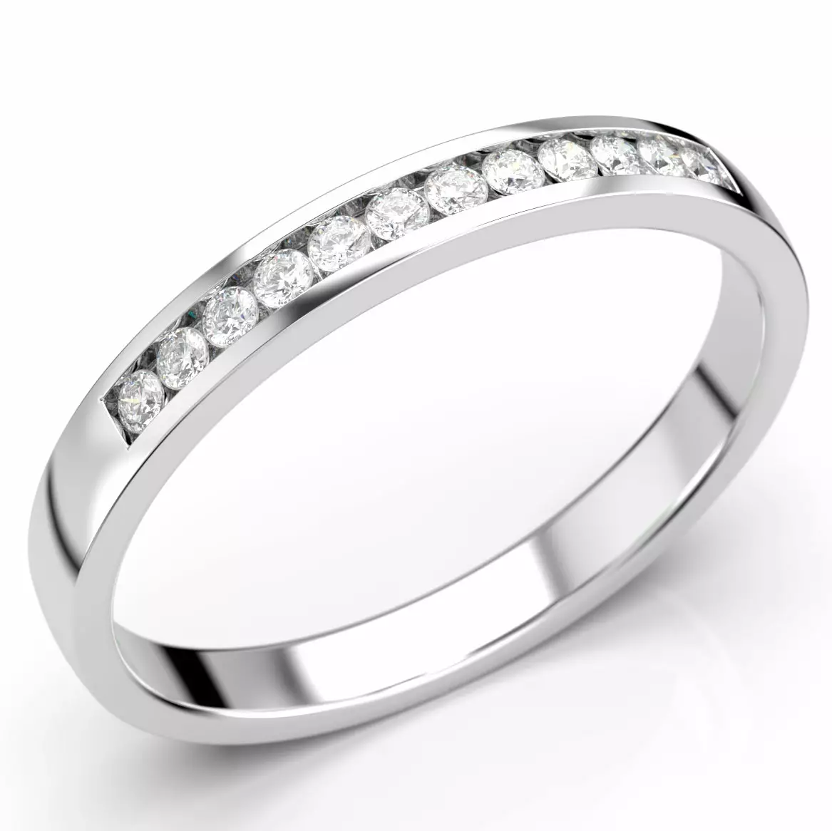 Tyylikäs ja ajaton rivitimattisormus. Sormus on leveydeltään 2,5mm vahva ja siihen on istutettu 12kpl 0,01ct timantit. Kullan pitoissuus on 14 karaatin valkokultaa.