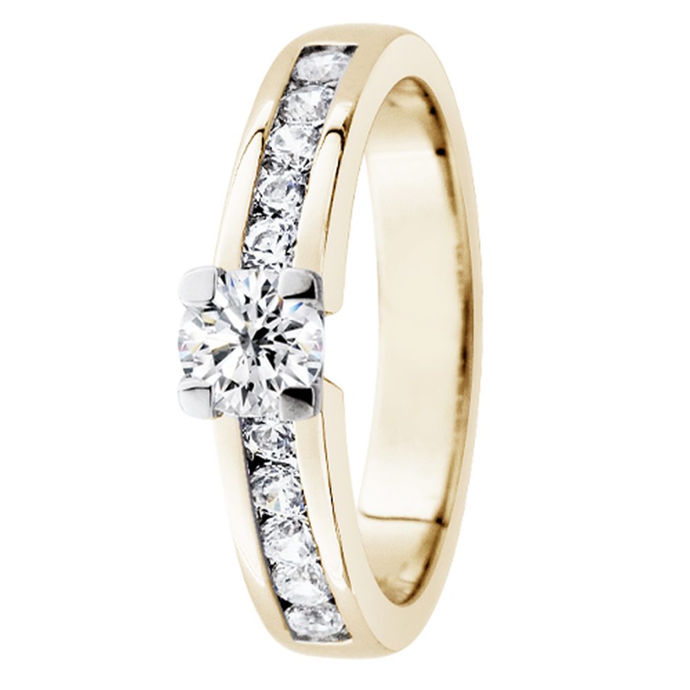 Erittäin kaunis Festive timanttisormus, jota koristavat kauniit timantit. Sormus on valmistettu 14 karaatin keltakullasta ja sen timanttien kokonaispaino on 0,90ct W/SI. Sormuksen keskelle on istutettu 0,40ct W/SI timantti, jonka ympärille on istutettu riveihin yhteensä 10x 0,05ct timantit. Kaikki Festive- tuotteet on suunniteltu ja valmistettu Suomessa.