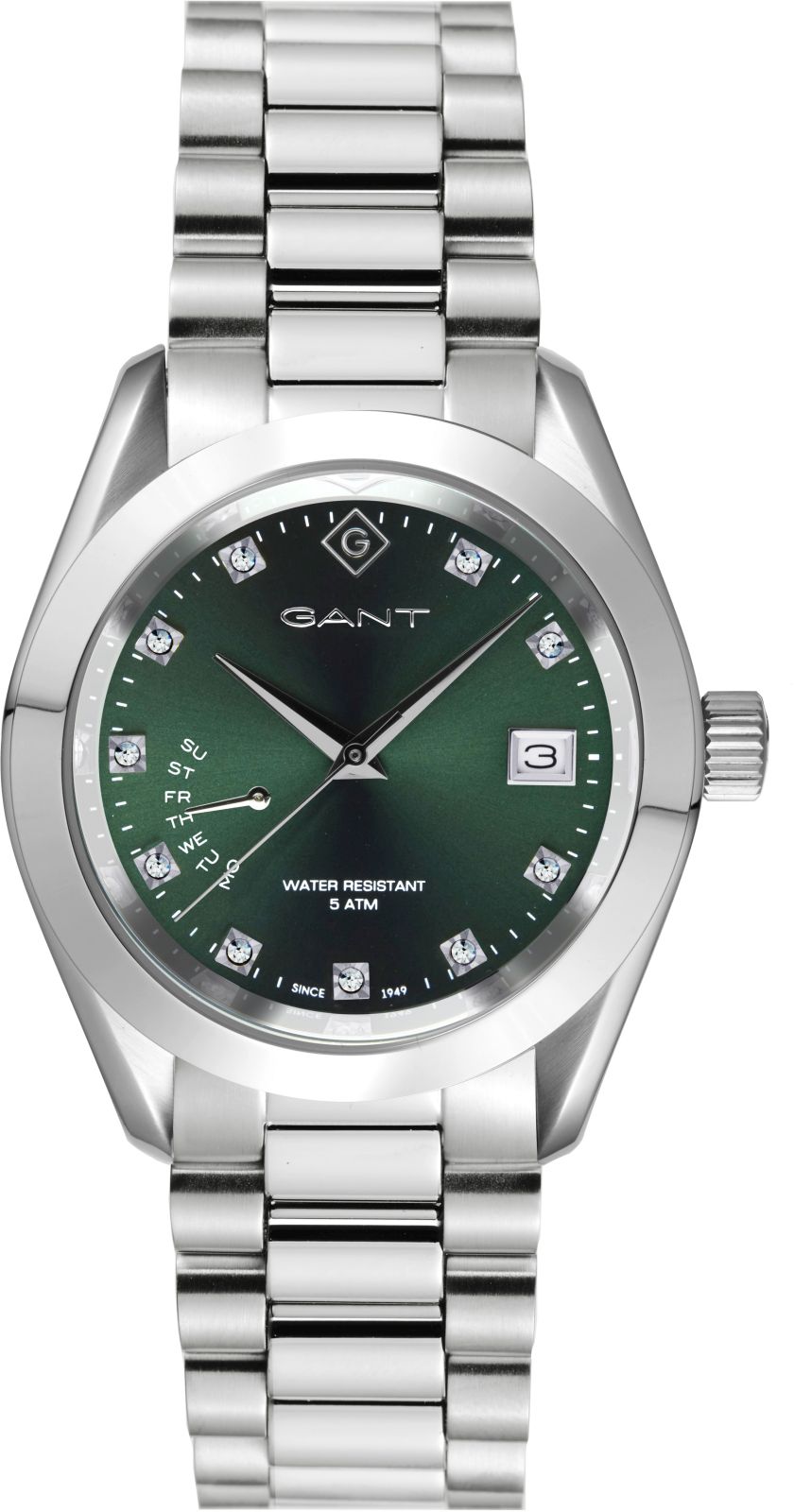 Gantin naisten teräksinen rannekello, vihreällä taululla. Teräsrannekkeellinen malli, 35mm halkaisijalla varustettu kellotaulu. Kellotaulun indekseinä kivet, viikonpäivä ja päivämäärä näkymät. Tuotteelle kirjoitetaan kahden vuoden takuu ja se toimitetaan tuotemerkin omassa rasiassa. Kellon takakanteen mahdollista toteuttaa myös kaiverrus.