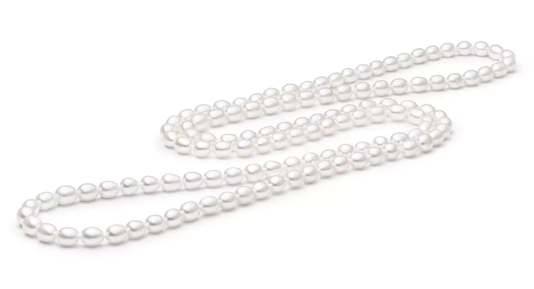Gaura Pealsin pitkä helminauha koostuu riisin muotoisista makeanvedenhelmistä, joiden halkaisija on 7,5m - 8,5mm