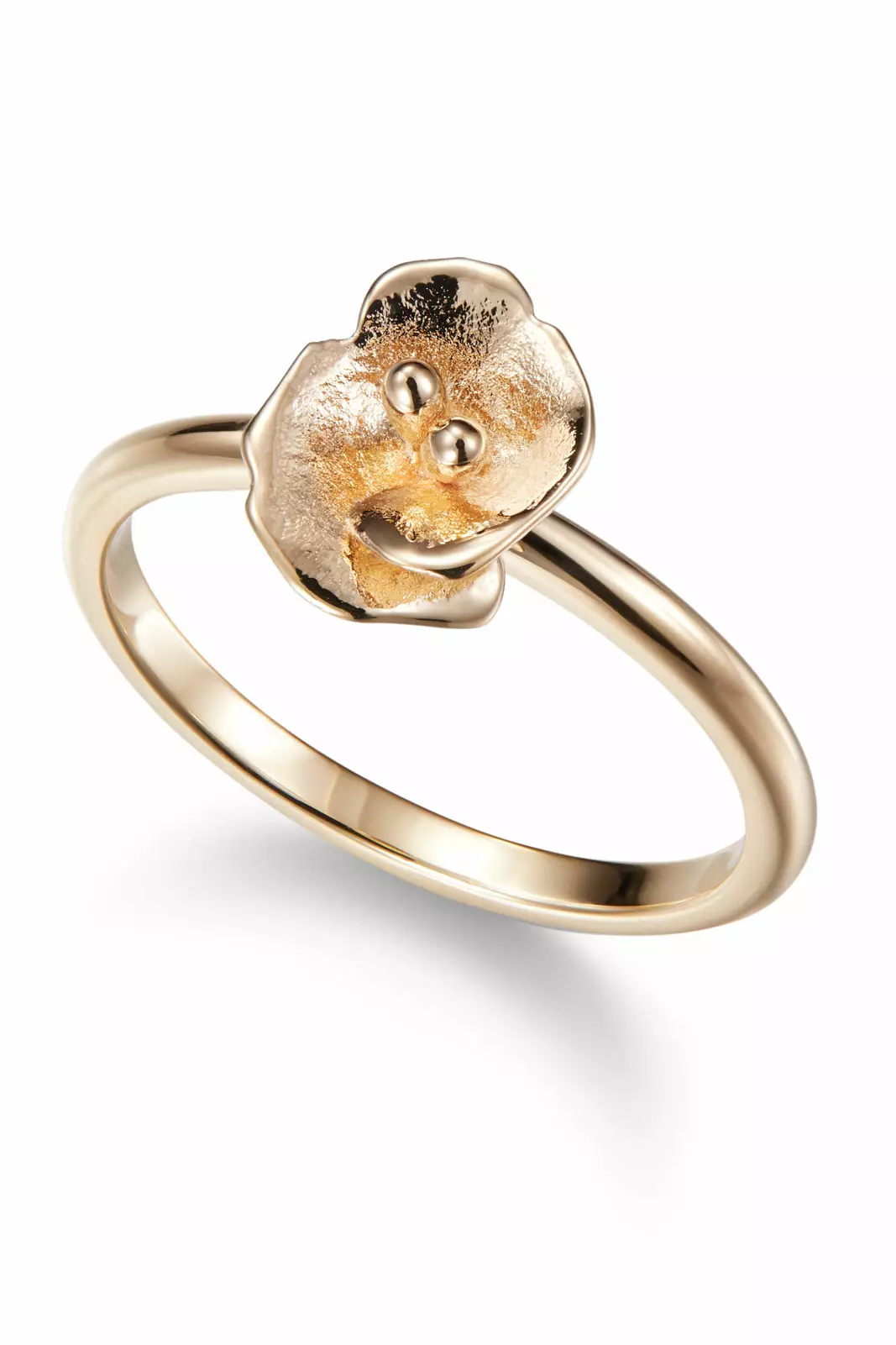 Kultaisessa sormuksessa näyttävä, veistoksellinen kukkaelementti kohoaa sirosta, pelkistetyn puhdaslinjaisesta sormusrunosta. Kontrasti kevyen rungon ja yksityiskohtaisen kukkamuodon välillä tekee sormuksesta samalla modernin ja romanttisen.