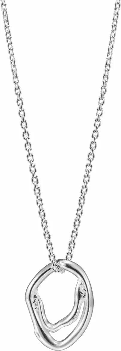 Riipus on valettu kokonaan kierrätetystä hopeasta, ja sen ontto nurja puoli tekee korusta miellyttävän kevyen käyttää. Minimalistinen muotoilu ilman erillistä riipuslenkkiä korostaa korun pelkistettyä eleganssia. Ketjussa on säädettävä pituus (42/45/50 cm), ja se suljetaan helppokäyttöisellä papukaijalukolla.