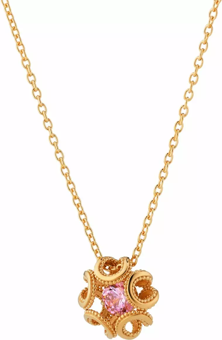 Riipus on valmistettu kullatusta hopeasta (925/1000), joka tuo siihen lämpimän ja ylellisen sävyn. Kullan hehku korostaa kauniisti korun pitsimäistä muotokieltä ja antaa sille arvokkaan ilmeen. Riipuksen keskiöön on istutettu säihkyvä pinkki zirkoni (6 mm), joka heijastaa valoa upeasti ja korostaa korun kerroksellisuutta. Vaaleanpunainen kivi tekee kokonaisuudesta herkän mutta samalla kiinnostavan ja rohkean.
