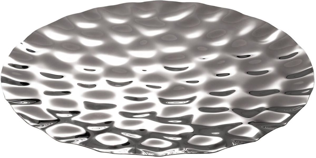 Teräksestä valmistettu kaunis tarjoiluvati, jonka pinta muistuttaa sadepisaroiden tanssista veden pintaan jäävää kuviota.