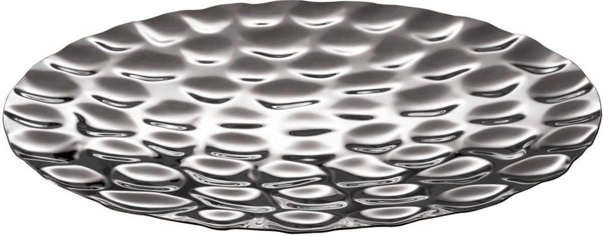 Teräksestä valmistettu kaunis tarjoiluvati, jonka pinta muistuttaa sadepisaroiden tanssista veden pintaan jäävää kuviota.
