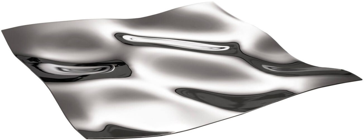 Teräksestä valmistettu kaunis tarjoiluvati, jonka pinta muistuttaa sadepisaroiden tanssista veden pintaan jäävää kuviota.