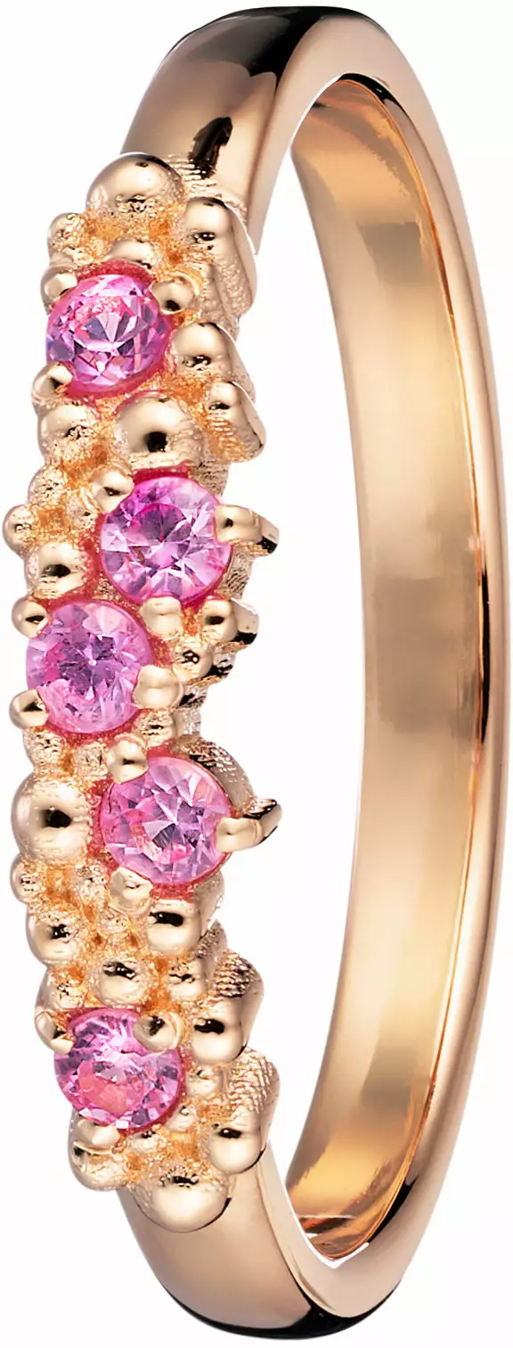 Lumoavan Tiara-sarjan kaunis safiirisormus. Valmistettu 14 karaatin keltakullasta, rungon leveys 2,4mm / 4mm. Viisi koristeellisesti istutettua vaaleanpunaisen sävyistä safiiria kruunaavat kokonaisuuden. Sormuksen suunnittelijana on toiminut Heikki Hartikainen.