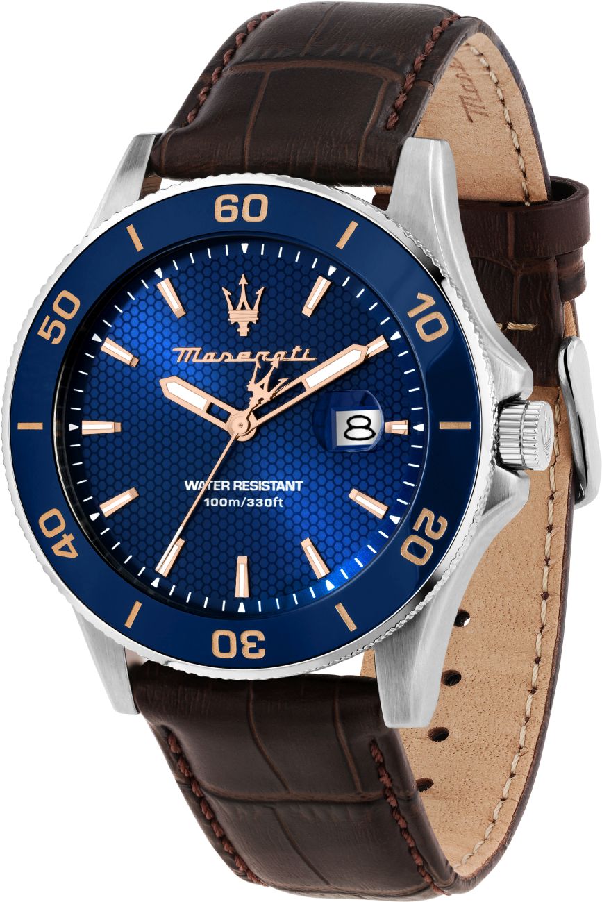 Maserati Competizione -kellon muotoilu heijastaa Maserati-autojen dynaamista kauneutta. Tummansininen kellotaulu, hopeiset ja punaiset yksityiskohdat sekä Maseratin logo tuovat esiin ylellisen ilmeen. Runko on valmistettu kestävästä ruostumattomasta teräksestä, joka kestää aikaa ja kulutusta. Ruskea nahkaranneke on sekä tyylikäs että mukava, mikä tekee tästä kellosta täydellisen kumppanin päivittäisiin seikkailuihin.