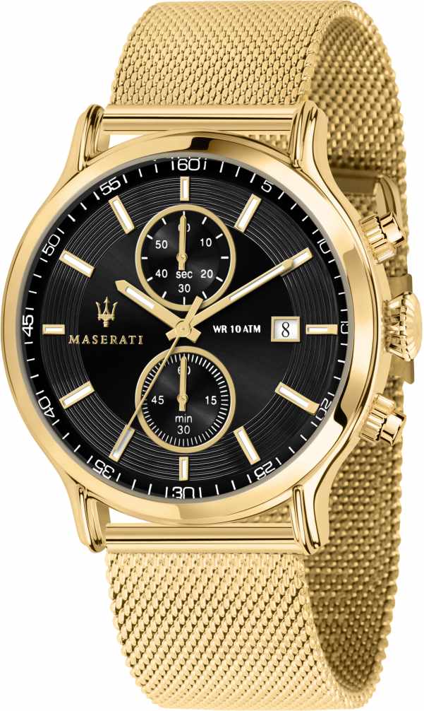 Todellinen italialaisen muotoilun taidonnäyte, joka yhdistelee taitavasti mustaan kullan väriseen runkoon kauniit keltakultaiset yksityiskohdat. Tämä kronografi-toiminnoilla varustettu kello kuuluu Maseratin näyttävään Epoca-sarjaan. Kronografi-rungostaan huolimatta kellon vesitiiveysluokka on messevät 10 ATM, joten sitä ei tarvitse poistaa ranteesta edes uimisen ajaksi. Kellon runko ja ranneke ovat vahvaa ruostumatonta terästä. Kellotaulun halkaisija on 42 mm ja paksuus 12 mm. Kellotaulusta näkyy yhdellä silmäyksellä kellonajan lisäksi myös vuorokaudenaika sekä päivämäärä. Mustan mesh-rannekkeen leveys on 21 mm. Rannekkeen pituus on säädettävä 170 mm aina 220 mm saakka.